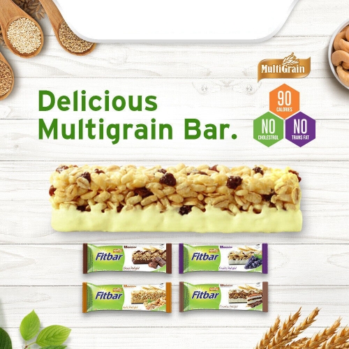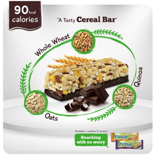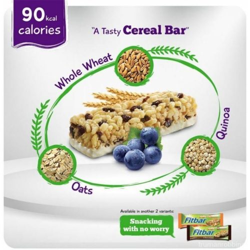 * Fitbar is a healthy snack made from Oat, Quinoa and Whole Wheat which is a source of fiber and also free of cholesterol, free of trans fat, and has a low calorie content. It's much lower than other snacks. With Fitbar now you can snacking with no worry!