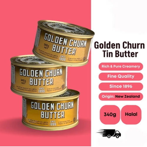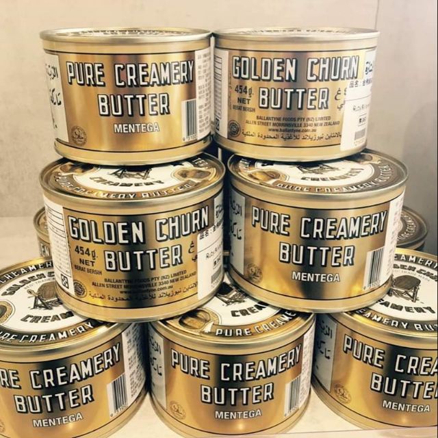 The ingredients in a can or tin of Golden Churn Pure Creamery Butter are pasteurized cream, water, and salt which gives it a long shelf life.