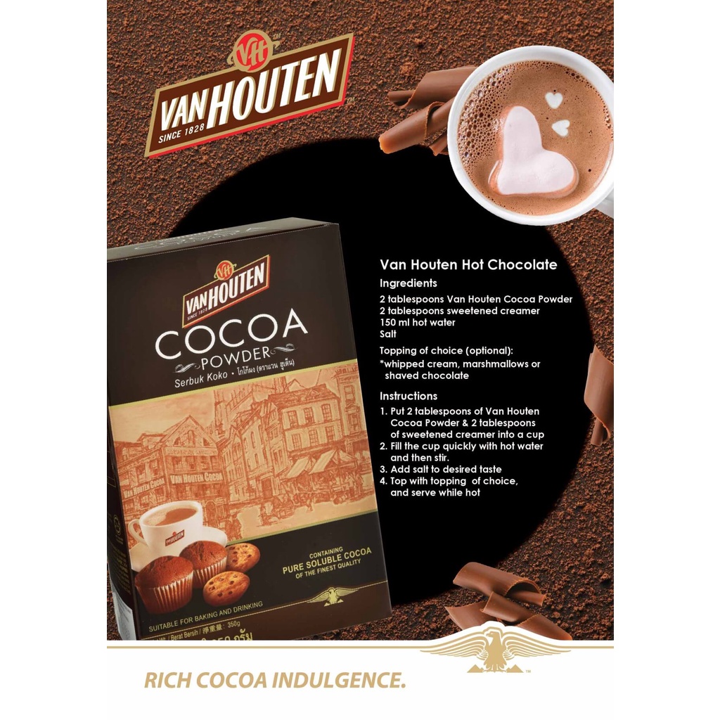 Van Houten Cocoa Powder 100g / 350g Van Houten Cocoa Powder is made from the finest quality of pure soluble cocoa. It gives a delightful chocolate taste and pleasant cocoa aroma. Suitable for baking and for making delicious cocoa drinks.