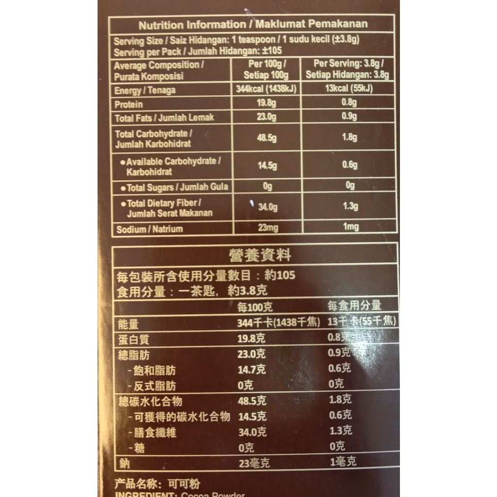 1) 100% cocoa powder 2) Halal certified 3) Suitable for baking and making chocolate drinks 4) Made from the finest quality of soluble cocoa 5) Gives a delightful chocolate taste and pleasant cocoa aroma