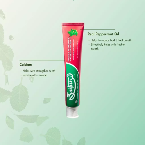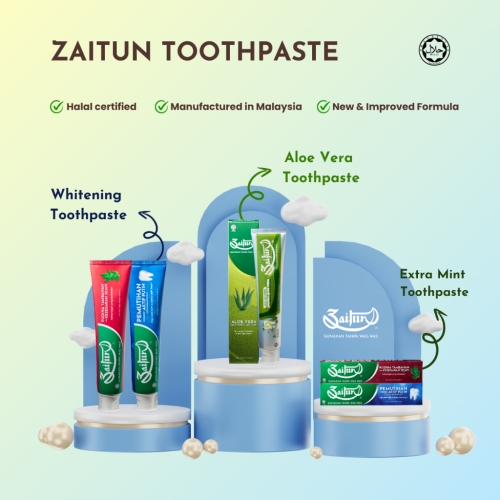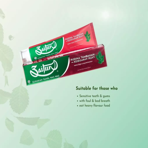 ZAITUN Extra Mint Toothpaste 175g - Calcium: help with strengthening teeth and remove plaque on teeth - Real Peppermint Oil: helps reduce bad and foul breath and helps to freshen breath and give long-lasting fresh breath. - Fluoride-free toothpaste.