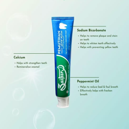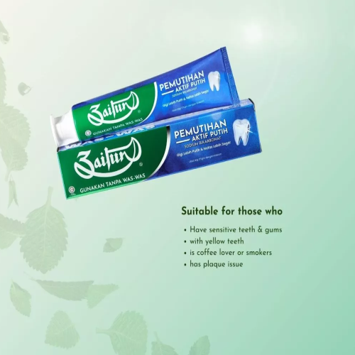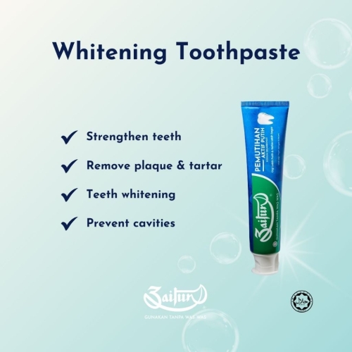 ZAITUN Whitening Toothpaste 175g - Calcium: help with strengthening teeth. - Sodium bicarbonate: helps remove plaque and stains on teeth, reduces yellowness, and whitens teeth. - Peppermint Oil: helps to freshen breath and reduces foul breath. - Brush regularly for better effect. - Fluoride-free toothpaste.
